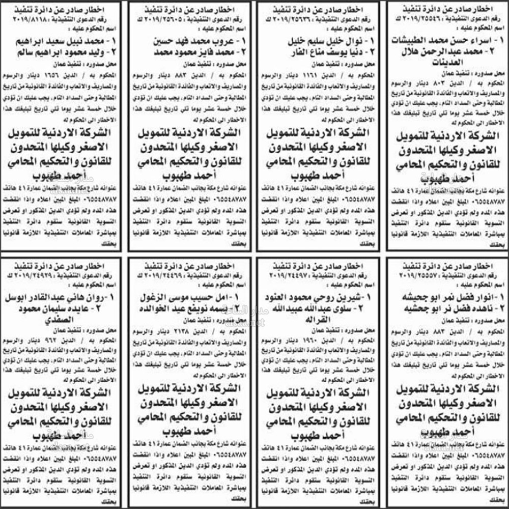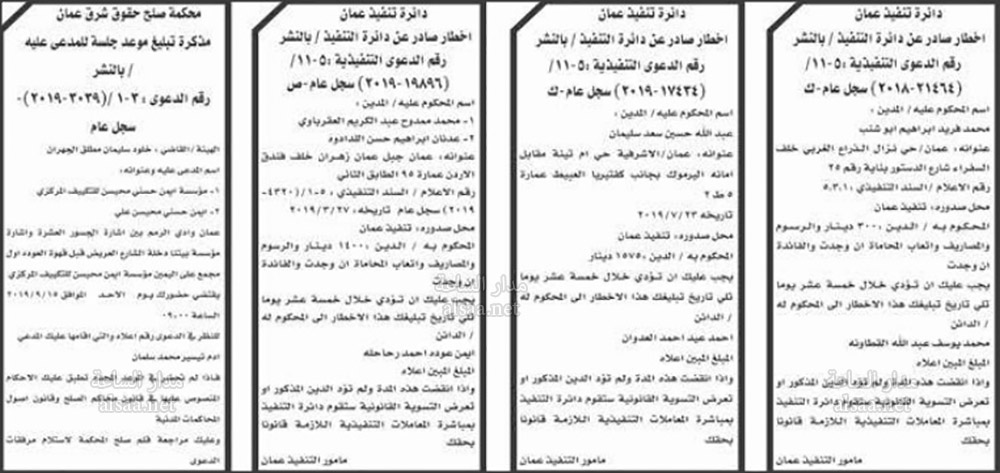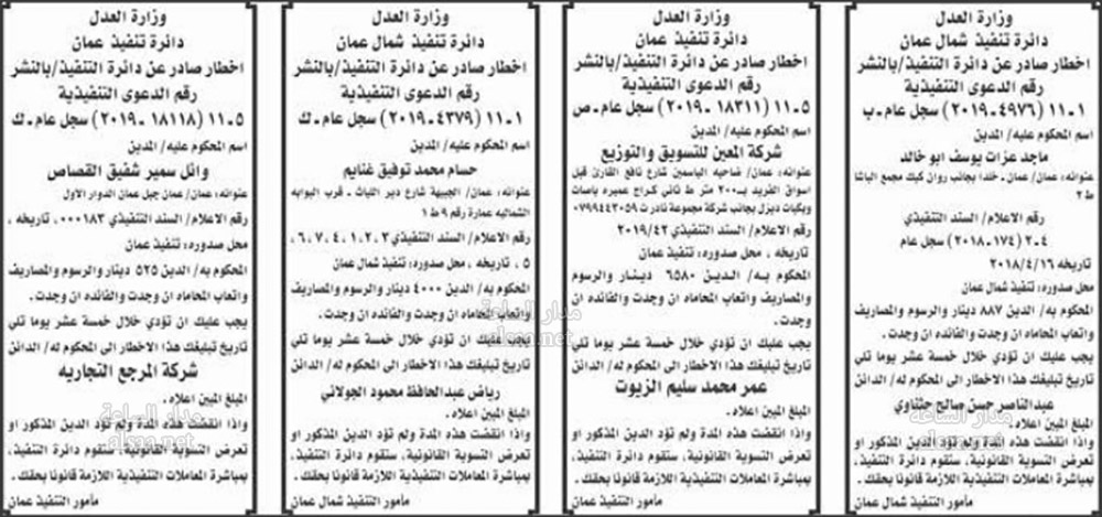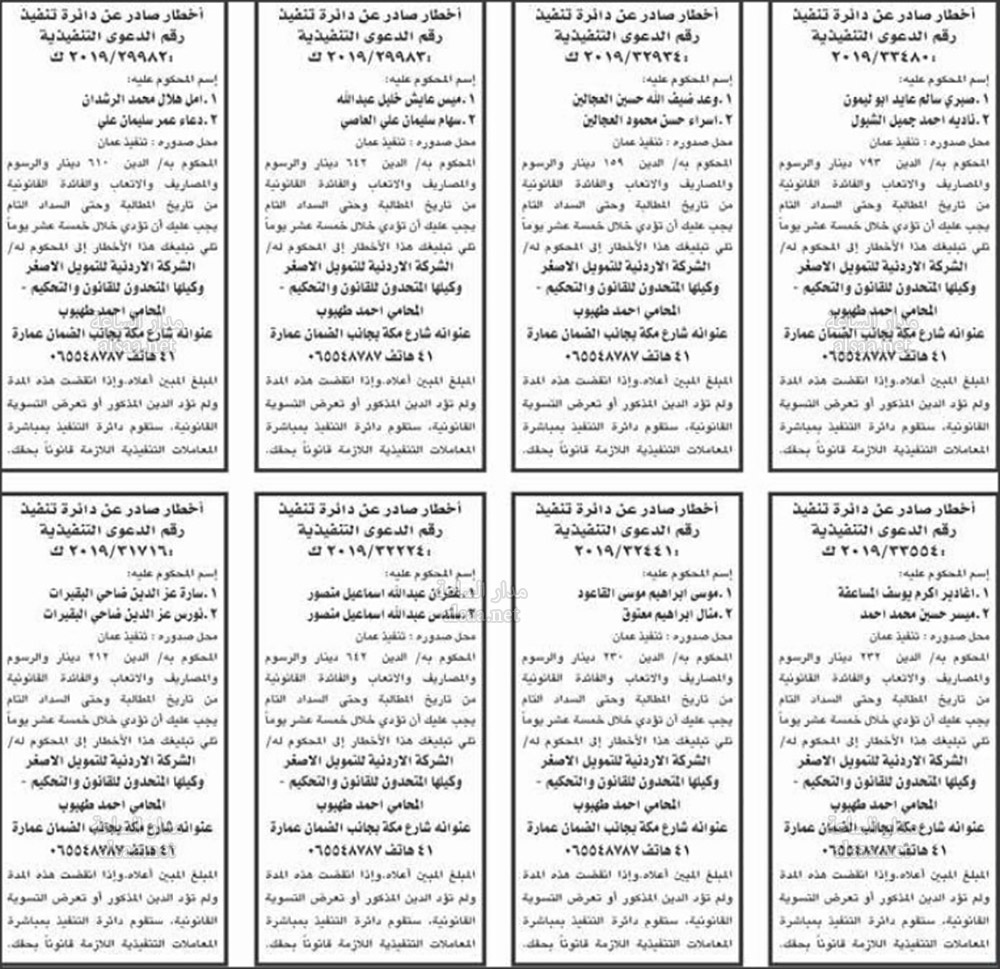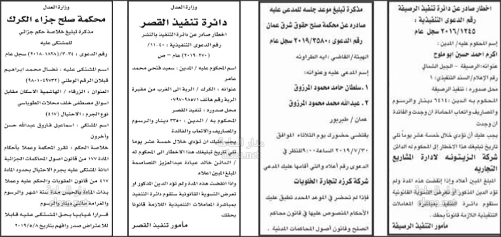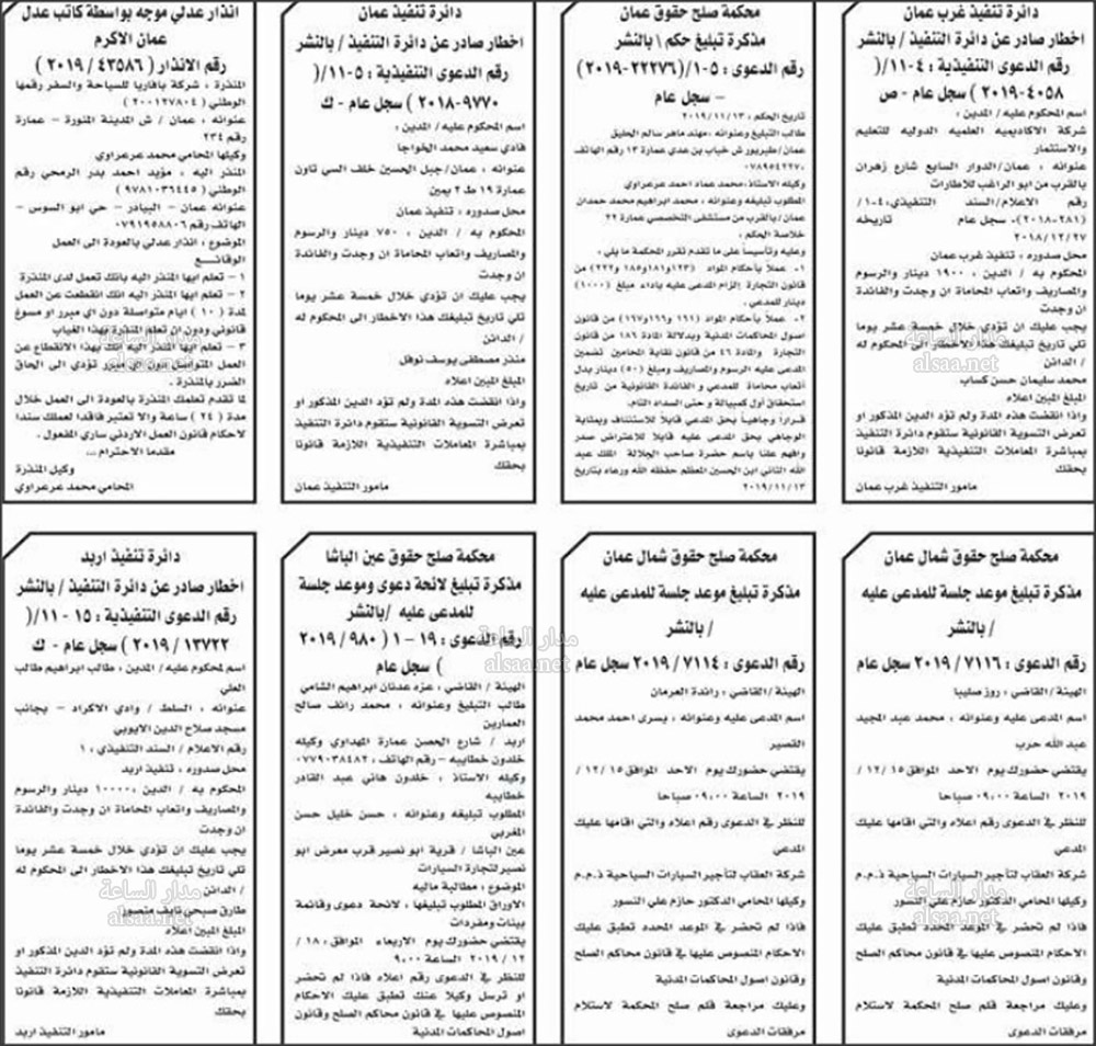 إنذارات عدلية وتنفيذ قضائي ومحاكم الاثنين 7 10 2019 أسماء