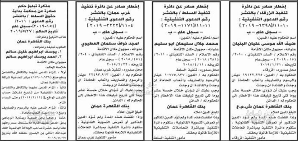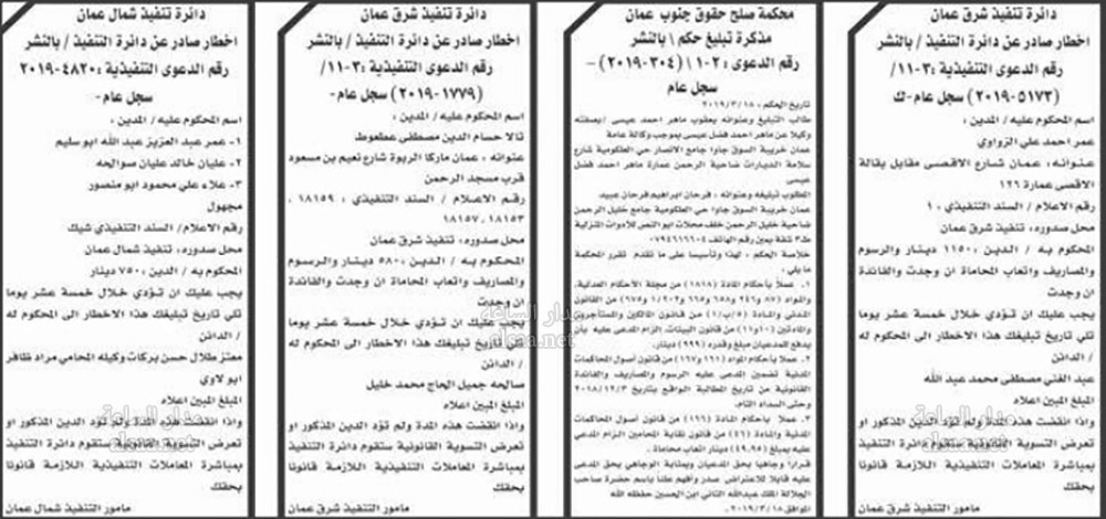 مذكرات تبليغ وأحكام وإنذارات عدلية وتنفيذ قضائي الثلاثاء 1 10 2019 أسماء الشريط الإخباري