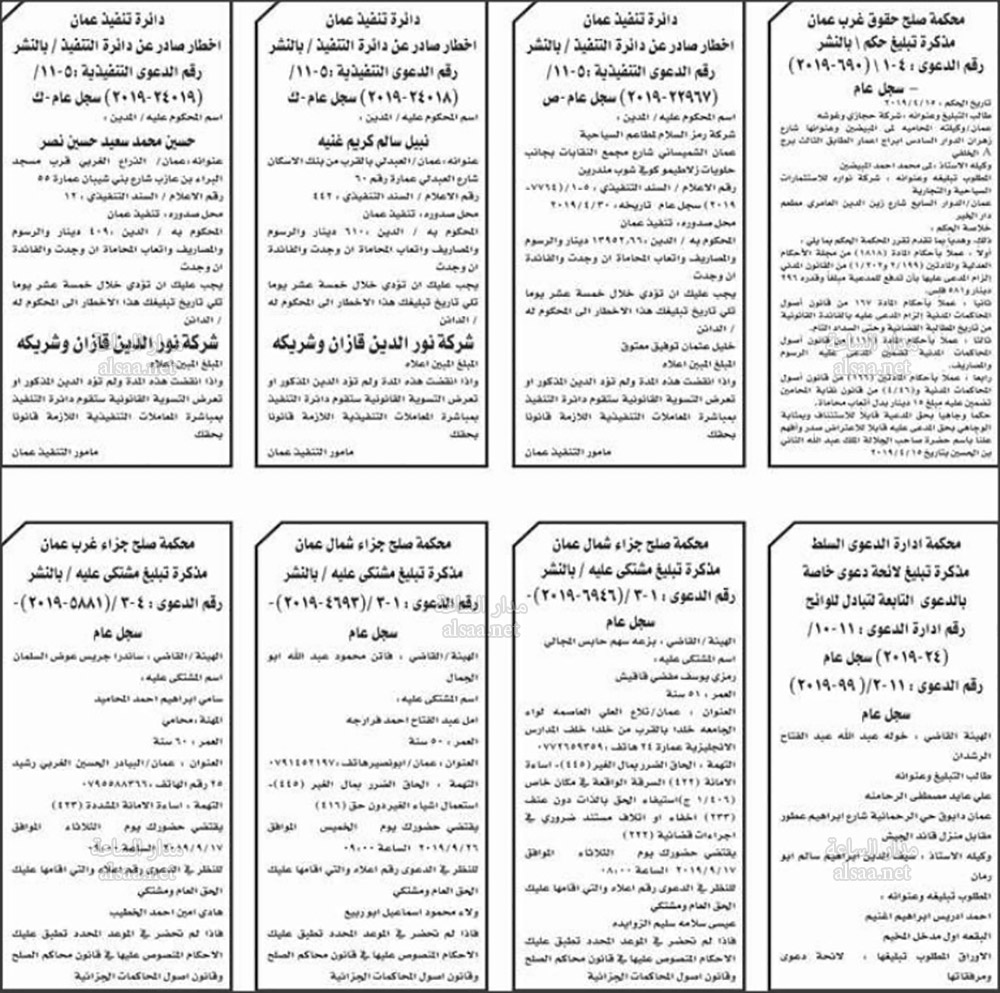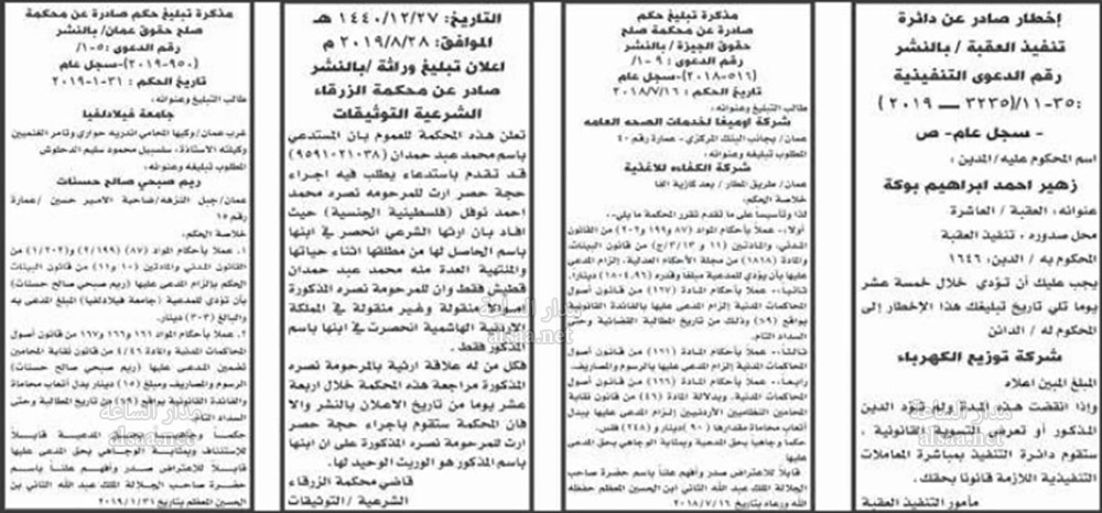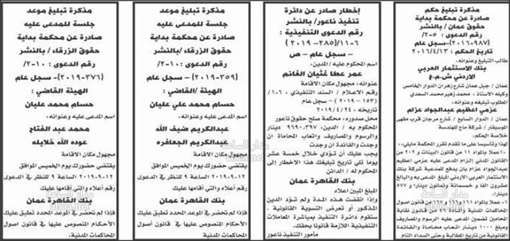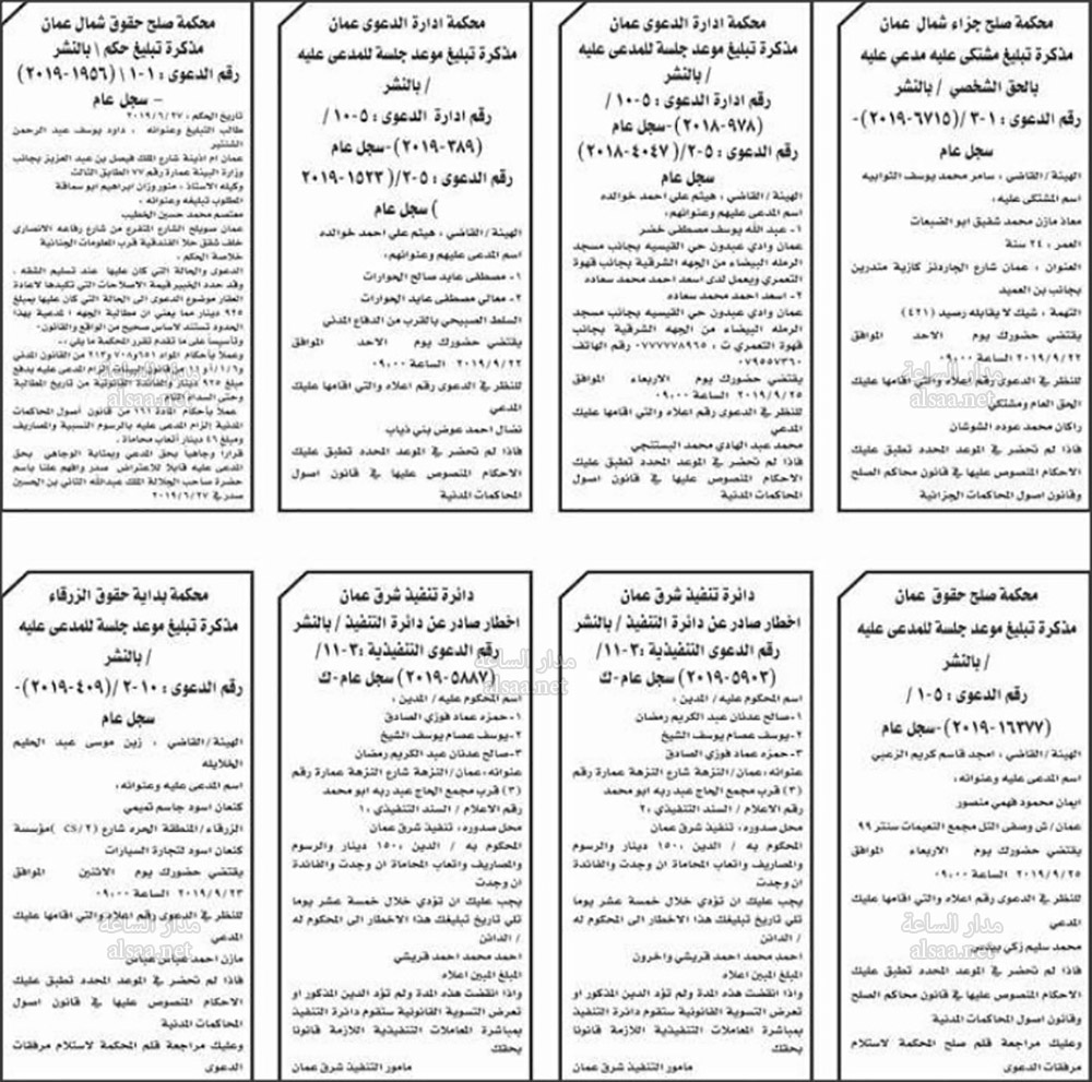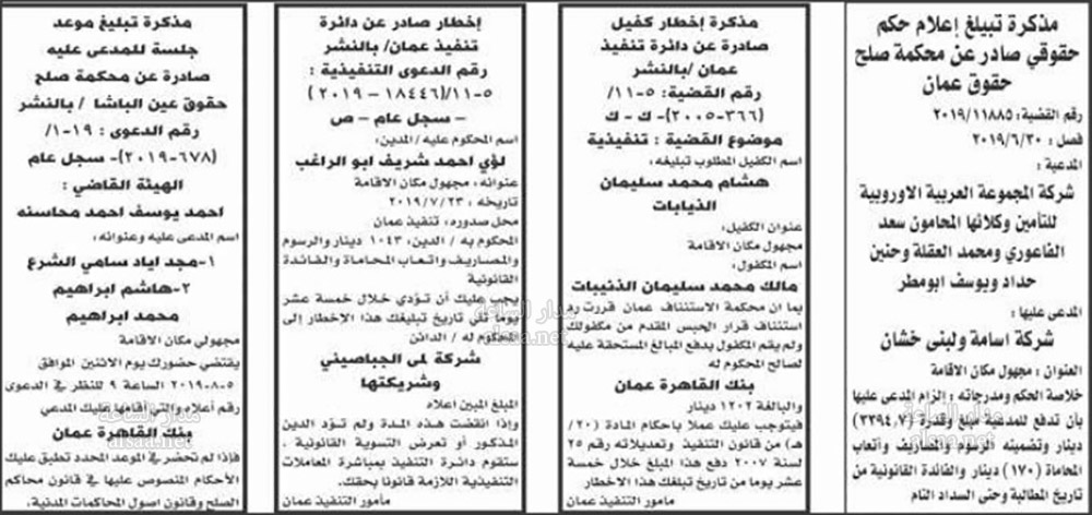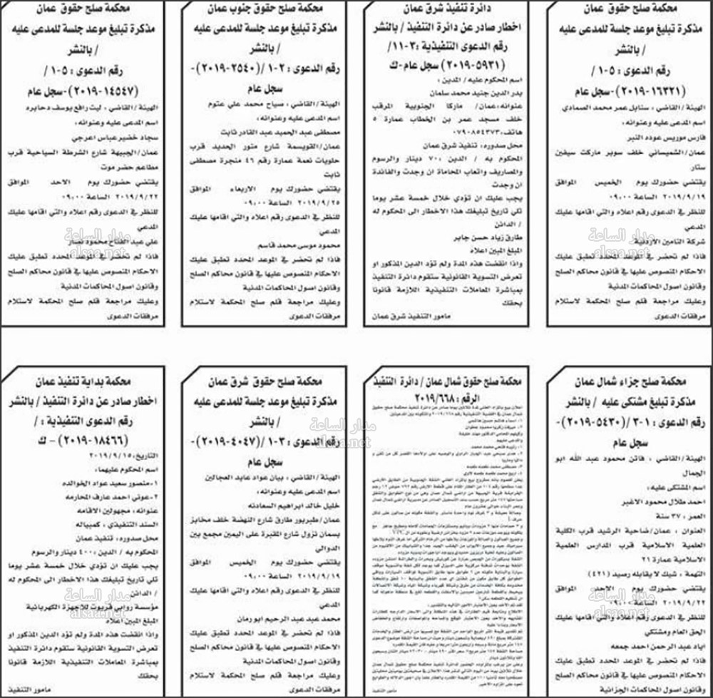 الأحد 15 9 2019 مذكرات تبليغ وأحكام وإنذارات عدلية وتنفيذ قضائي أسماء