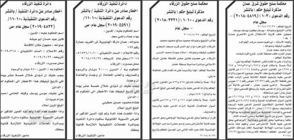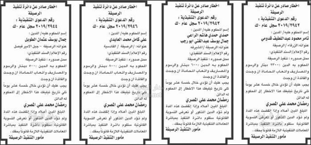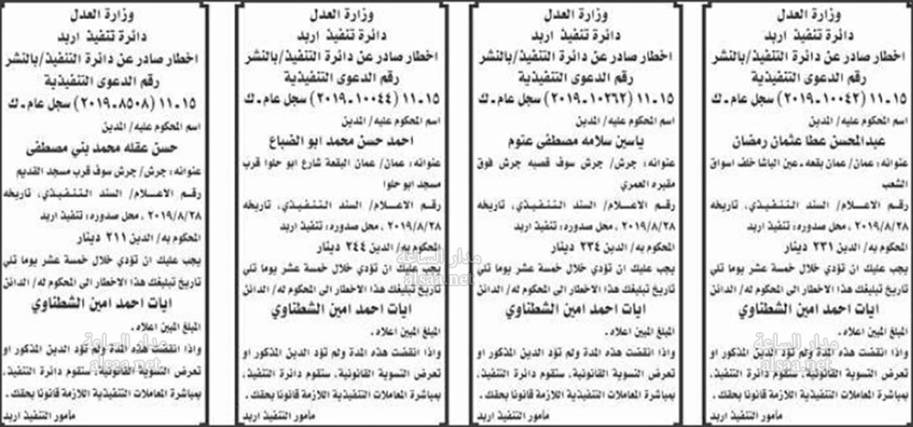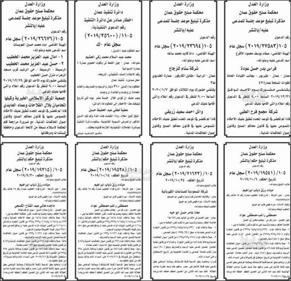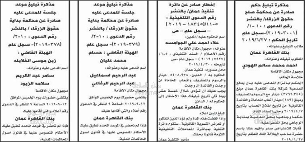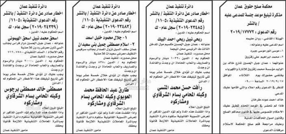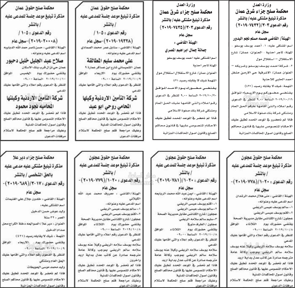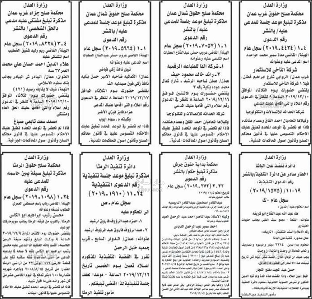 الأحد 15 9 2019 مذكرات تبليغ وأحكام وإنذارات عدلية وتنفيذ قضائي أسماء
