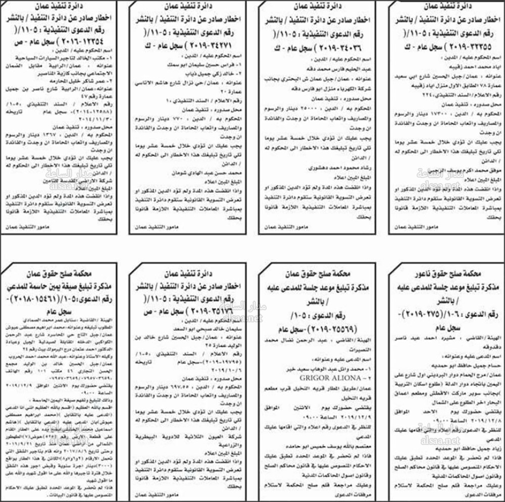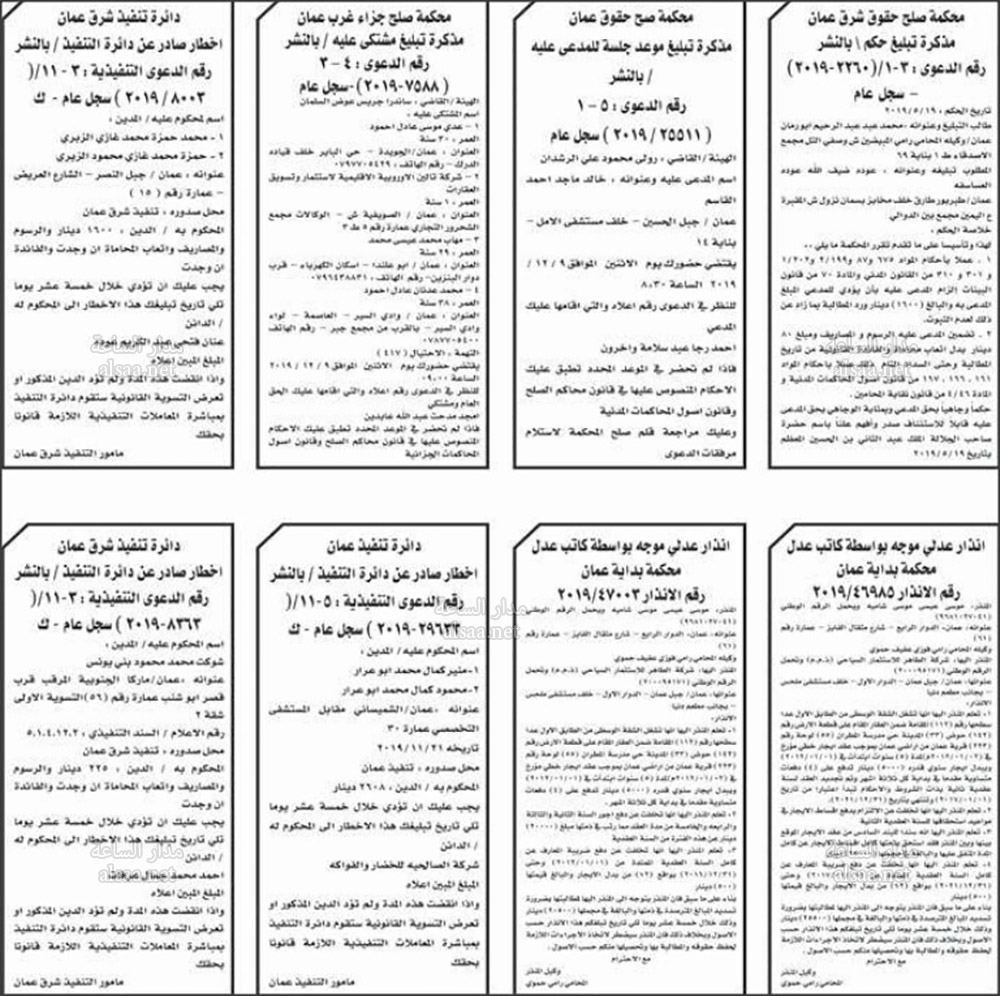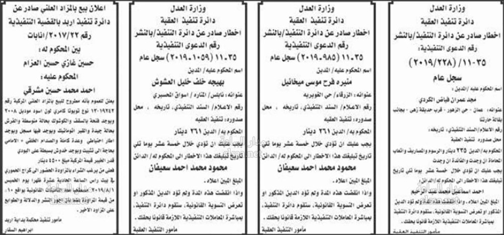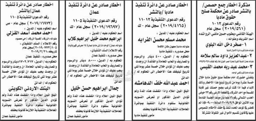 الأحد 15 9 2019 مذكرات تبليغ وأحكام وإنذارات عدلية وتنفيذ قضائي أسماء